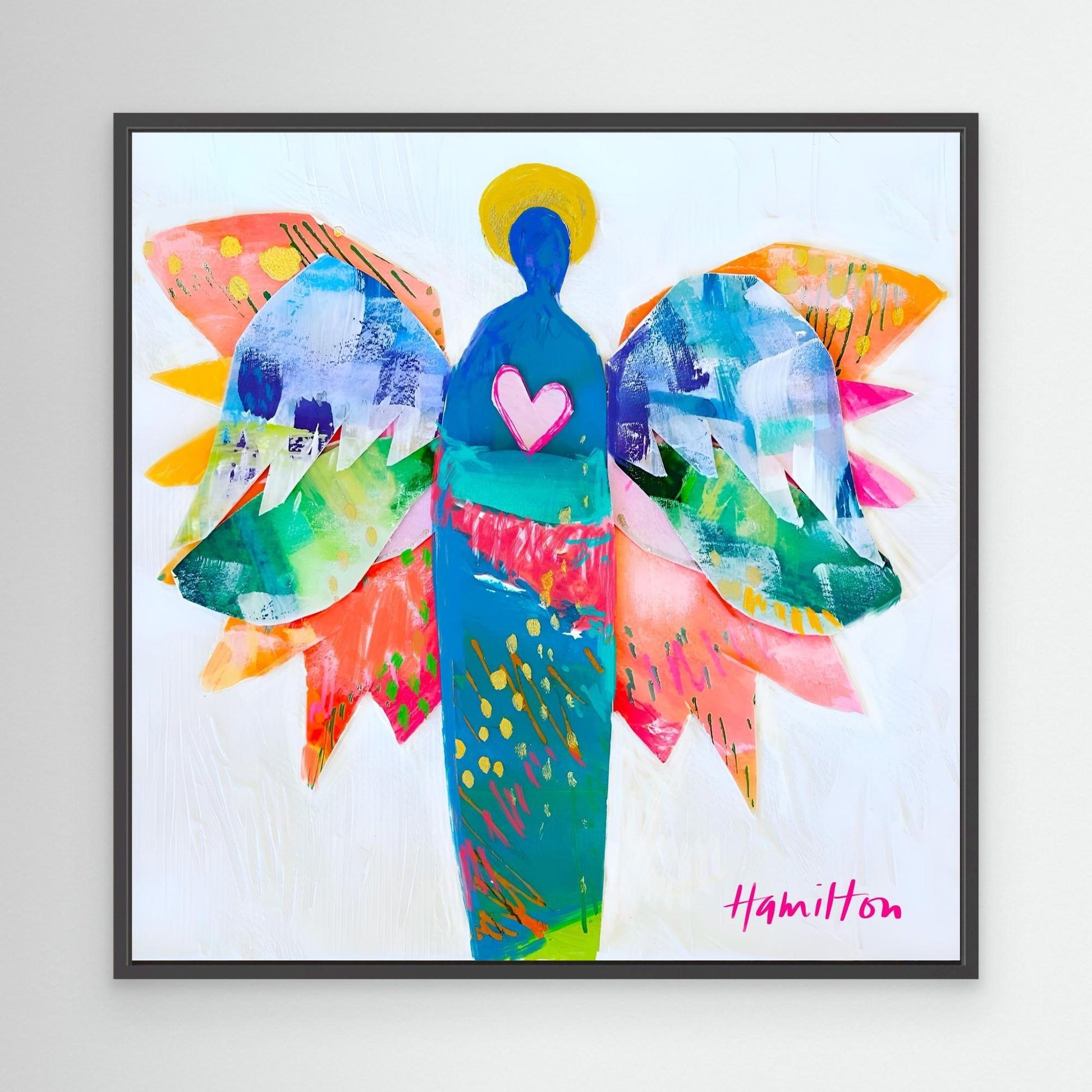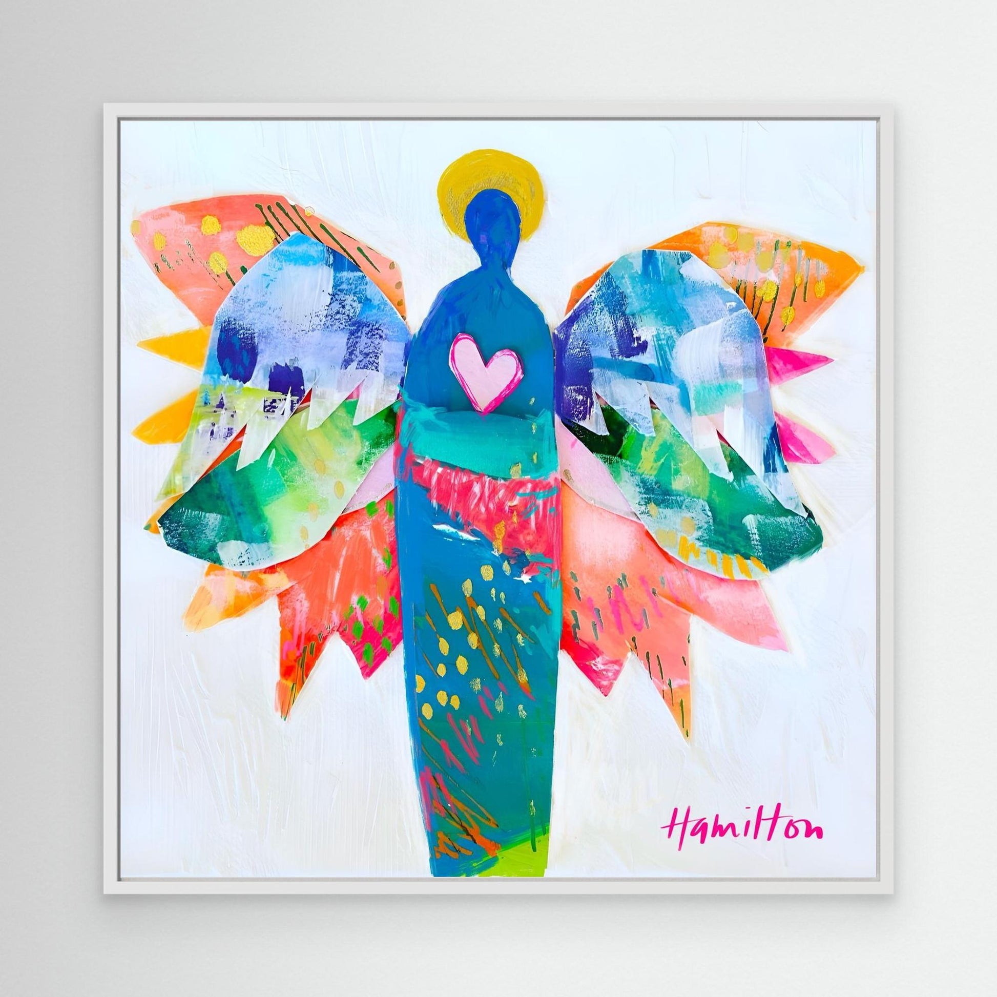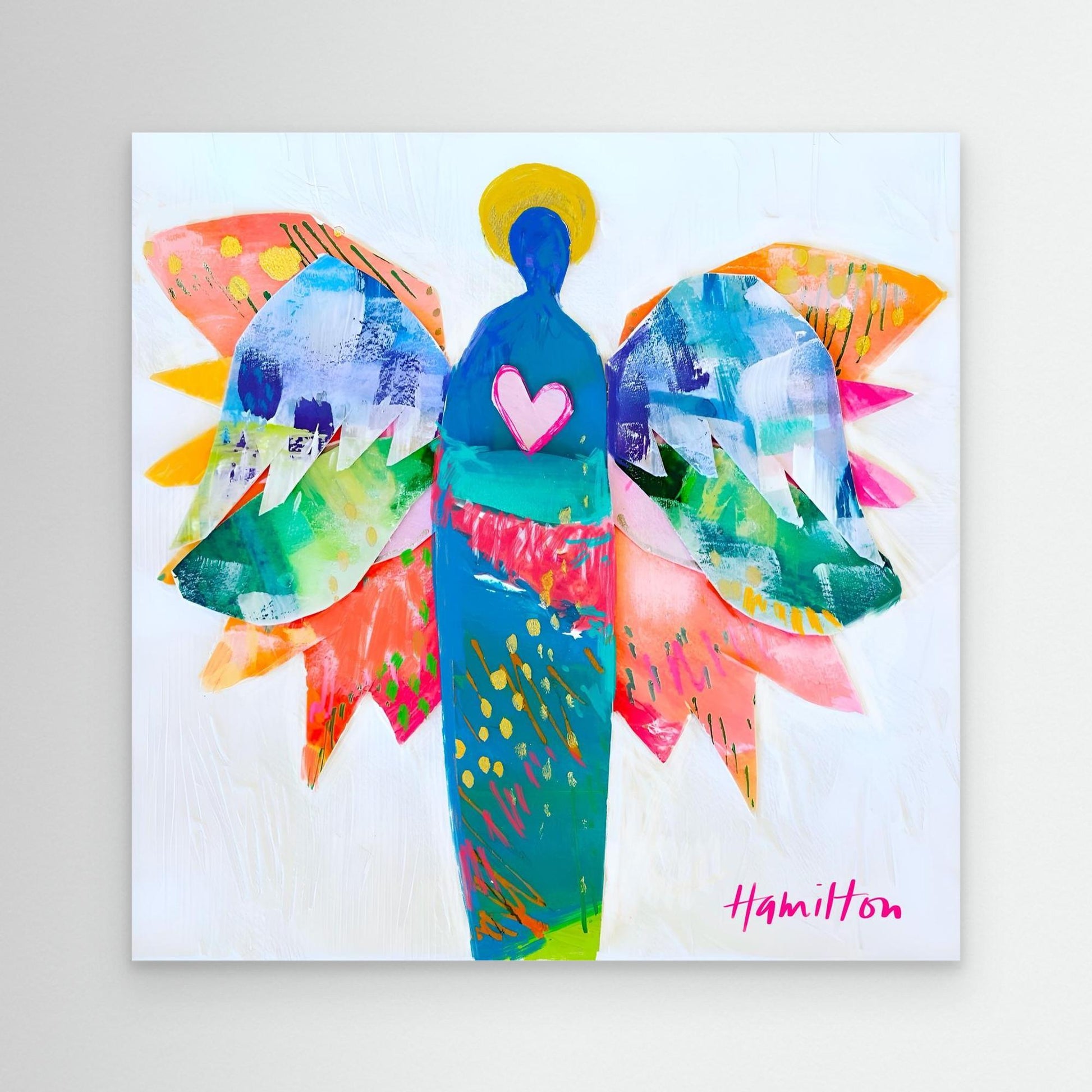 Connect with the radiant energy of the "Blessing Angel," an exquisite fine art print from the original mixed-media collage by Hamilton.