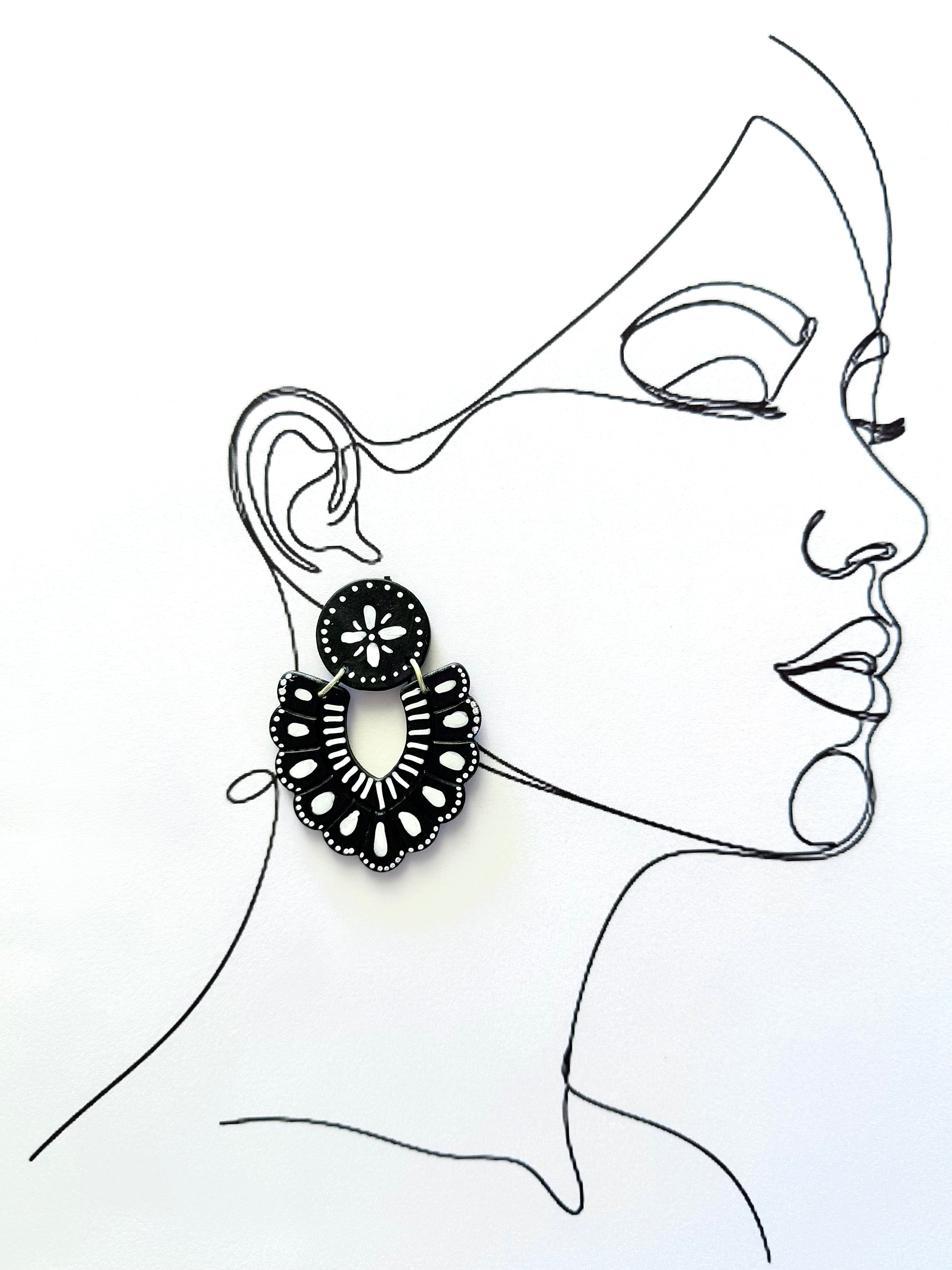 Hand painted and varnished polymer clay earrings. Earrings to scale on drawn model. From my Autumn Atelier Collection 2025.