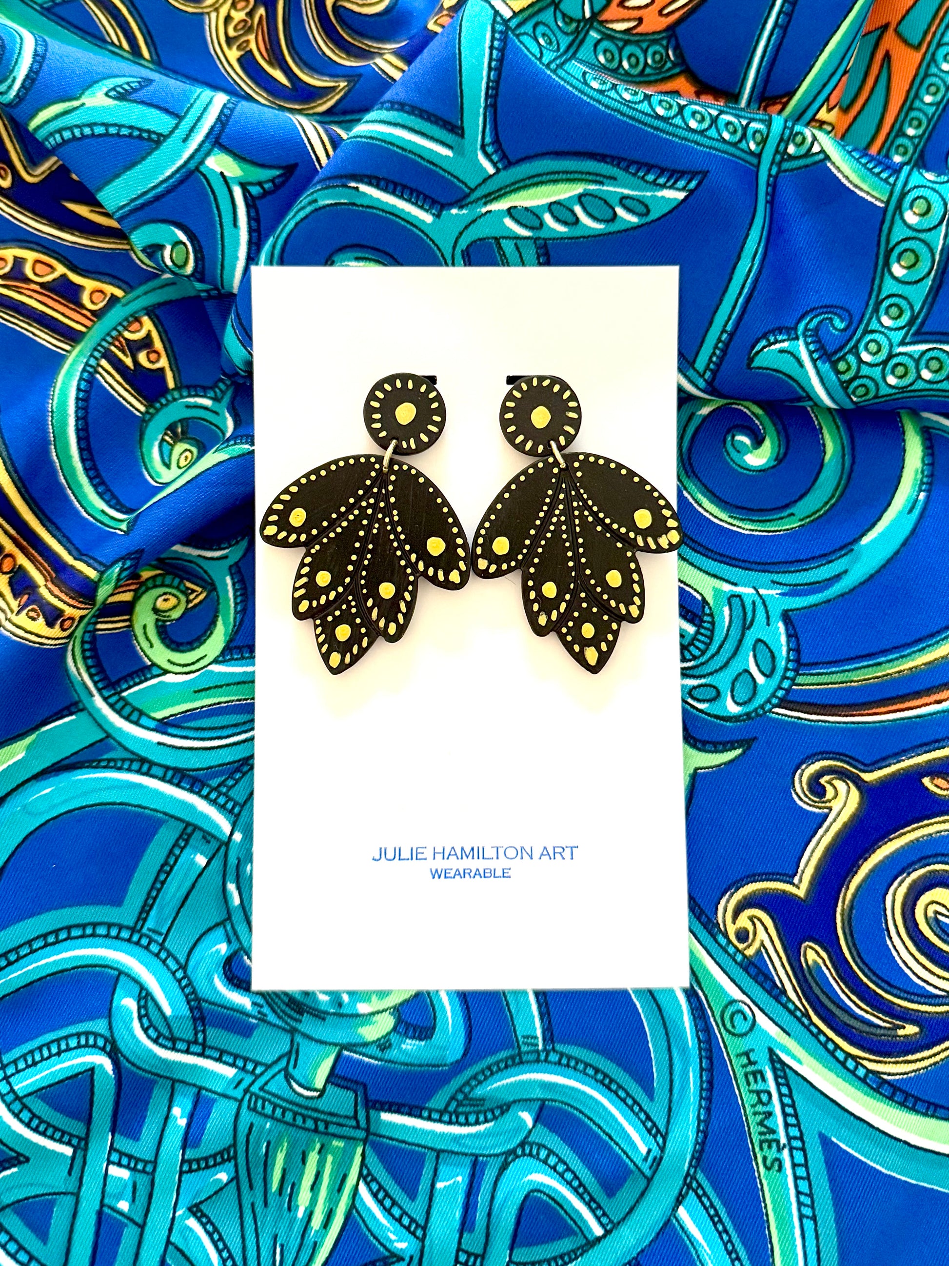 Hand painted and varnished polymer clay earrings. Earrings to scale on drawn model. From my Autumn Atelier Collection 2025.