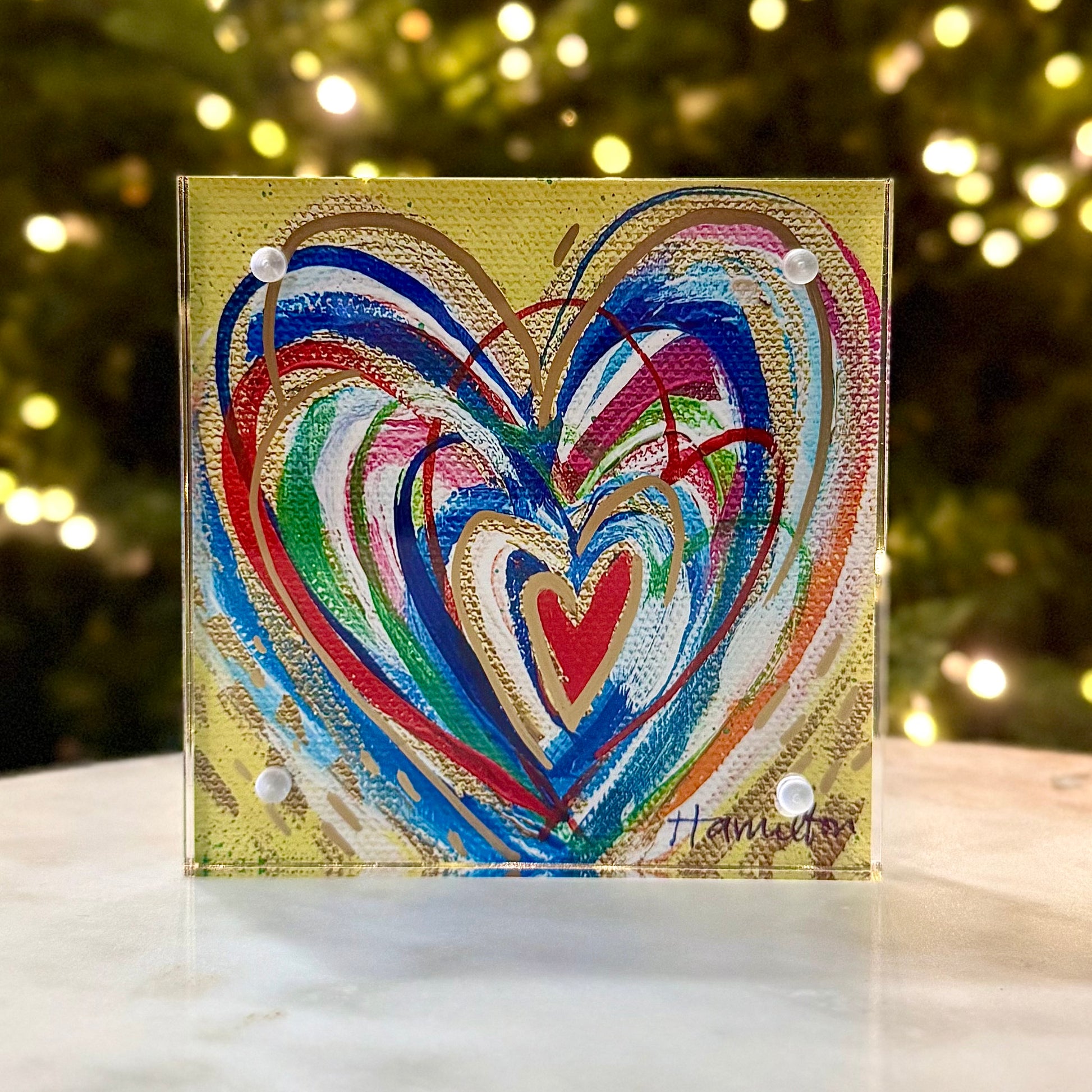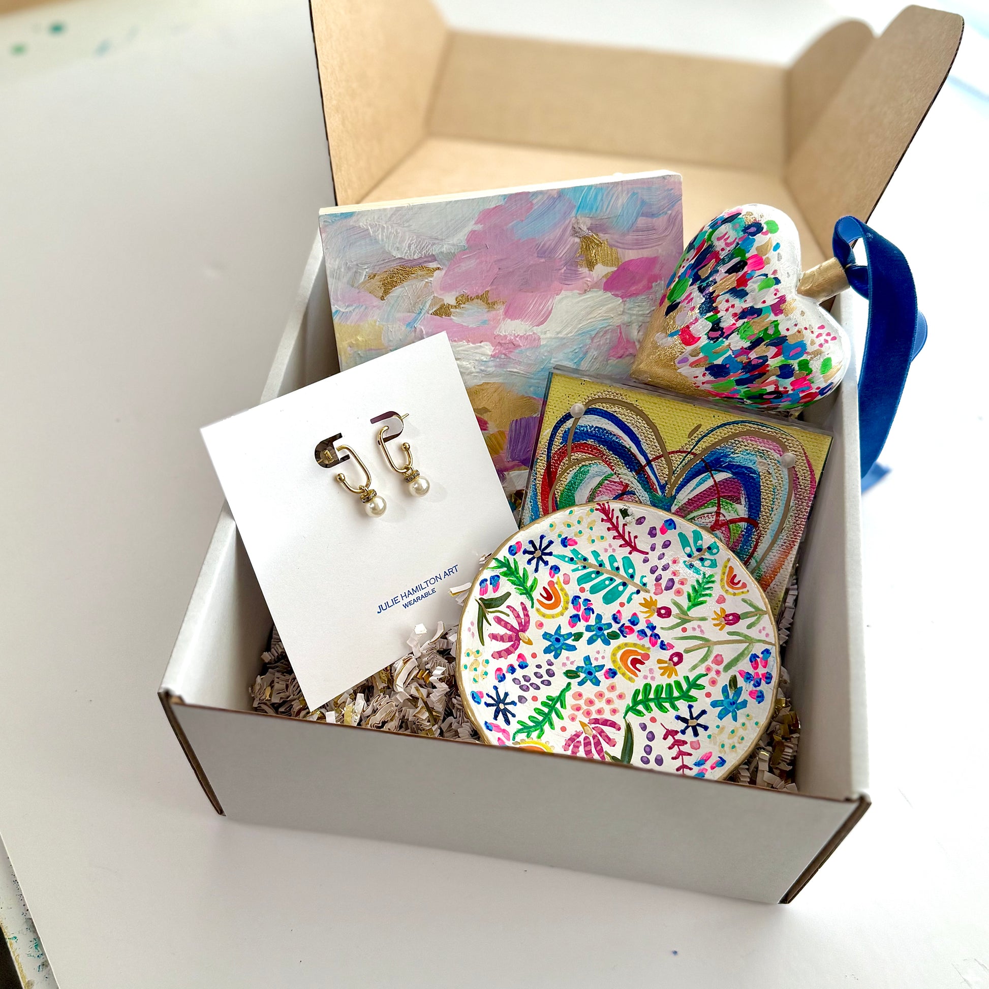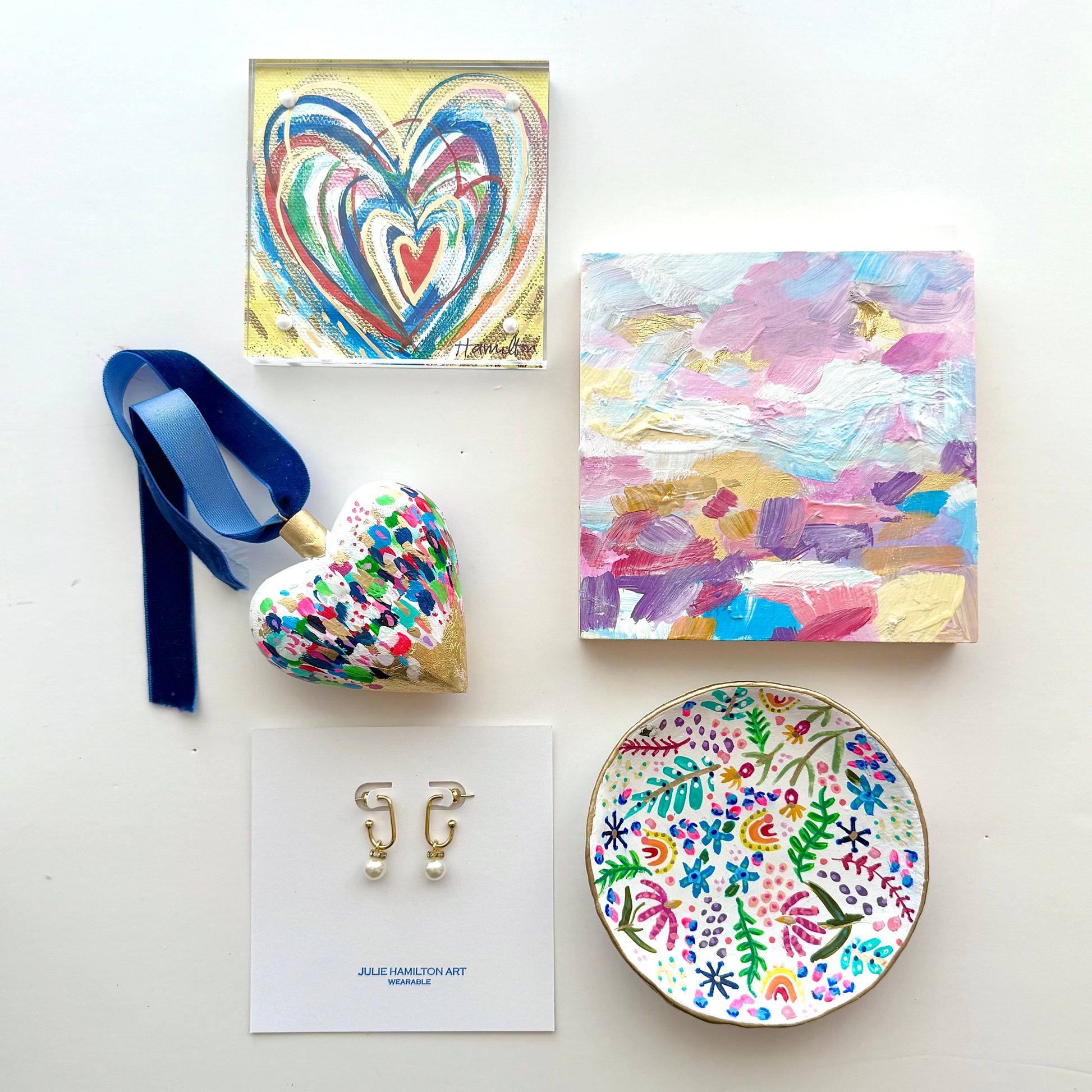 A $240 value! This special gift box collection features one of my abstract original landscape paintings “Cotton Candy Skies” with rich texture and gold leaf accents. It is perfectly paired with a fun floral jewelry dish that I sculpted and painted, an acrylic-framed “I CARRY YOUR HEART” Print in lemon (with e e cummings poem on back), and festive, gold plated pearl-drop earrings. Completed by a hand-painted solid wooden heart ornament tied with a lovely blue velvet ribbon.