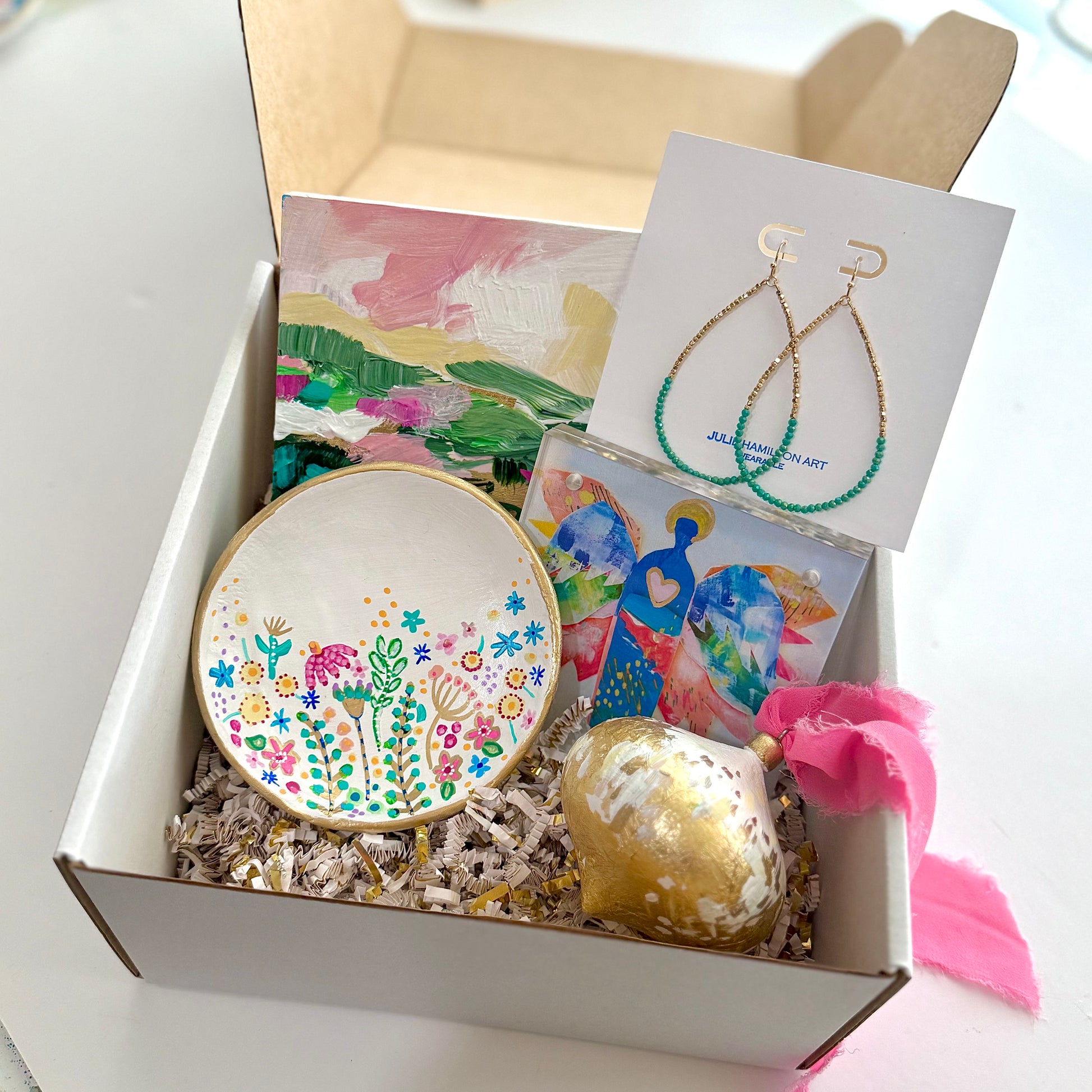 A $240 value! This special gift box collection features one of my abstract original landscape paintings “Meet Me on the Mountaintop” with rich texture and gold leaf accents. It is perfectly paired with a fun floral jewelry dish that I sculpted and painted, an acrylic-framed angel print, and festive, gold and turquoise beaded teardrop earrings. Completed by a hand-painted and gold leafed solid wooden ornament tied with a pink chiffon ribbon.