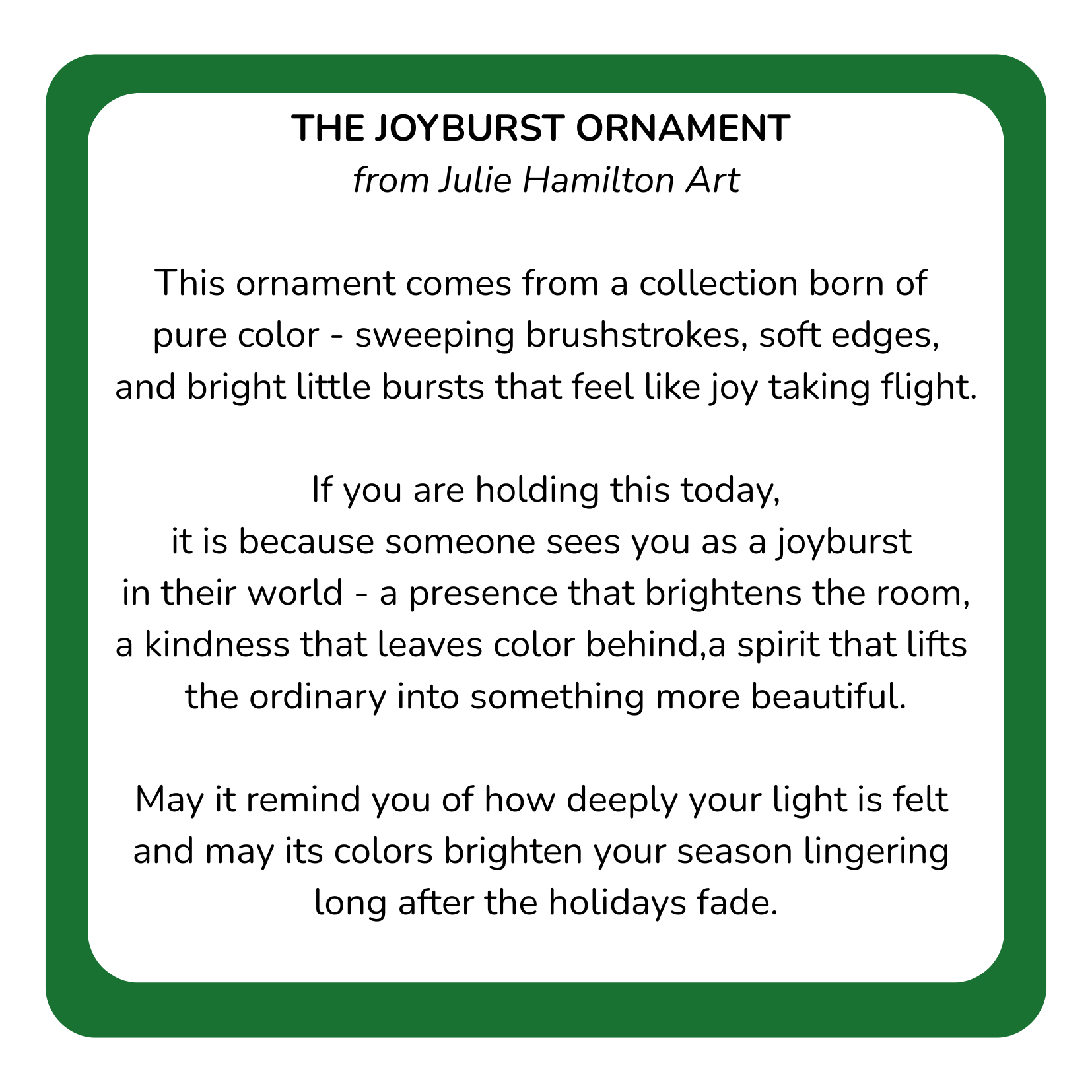 May it remind you of how deeply your light is felt and may its colors brighten your season lingering long after the holidays fade.