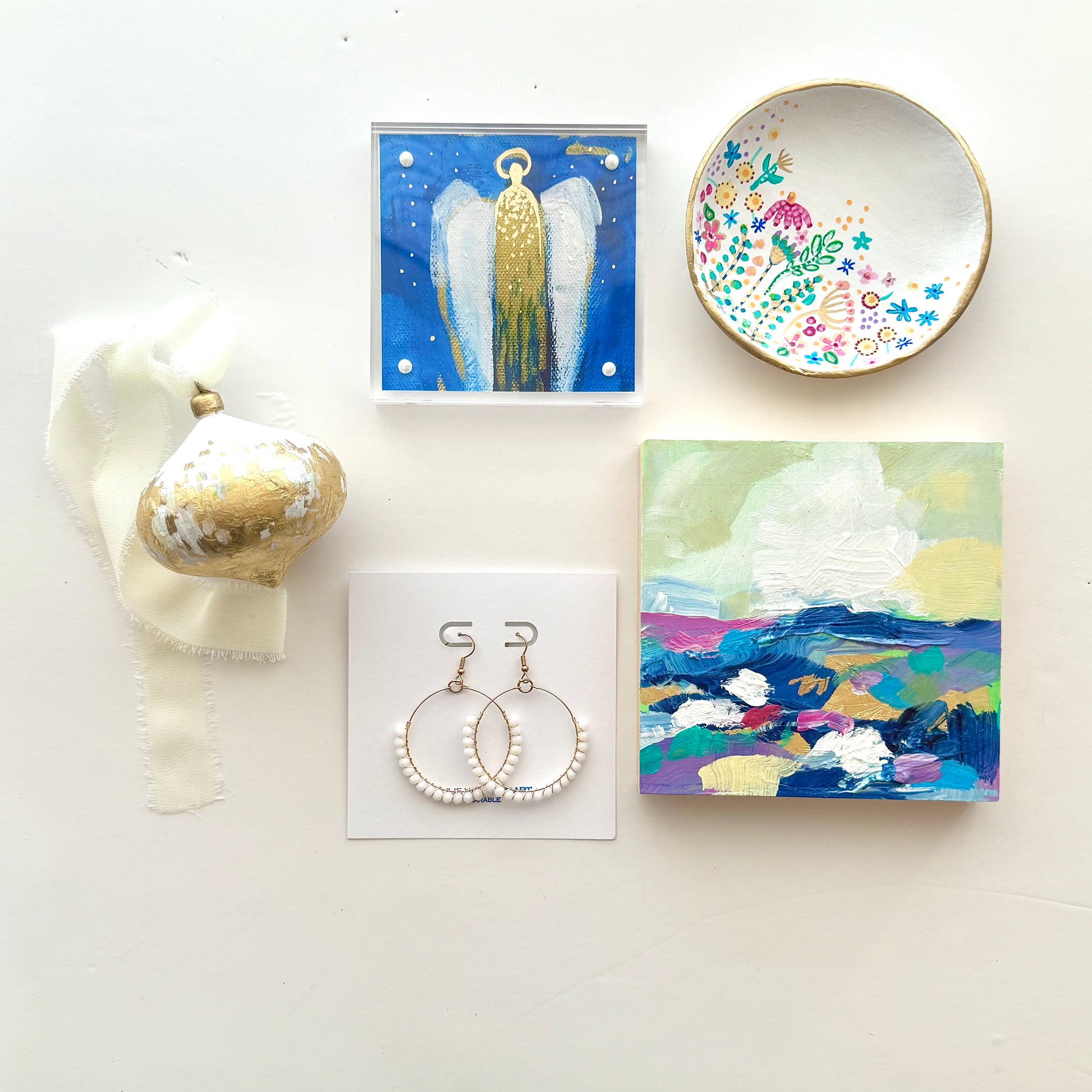 A $240 value! This special gift box collection features one of my abstract original landscape paintings “Homeplace” with rich texture and gold leaf accents. It is perfectly paired with a fun floral jewelry dish that I sculpted and painted, an acrylic-framed angel print, and festive, gold and turquoise beaded teardrop earrings. Completed by a hand-painted and gold leafed solid wooden ornament tied with a cream chiffon ribbon.