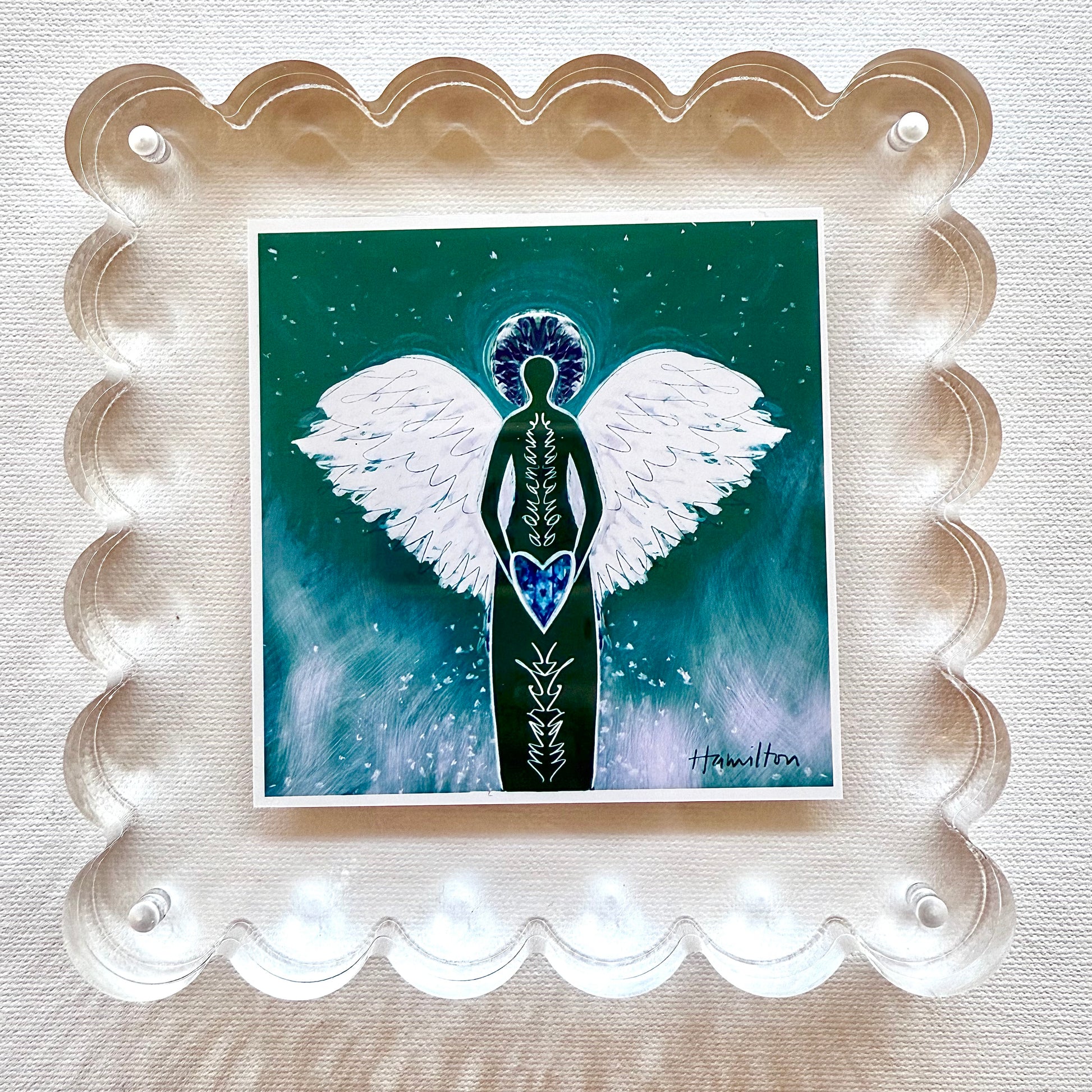• A Symbol of Light: The entire piece is beautifully framed in an elegant 6" x 6" scalloped acrylic frame, designed to be freestanding for effortless display on a desk, shelf, or nightstand.