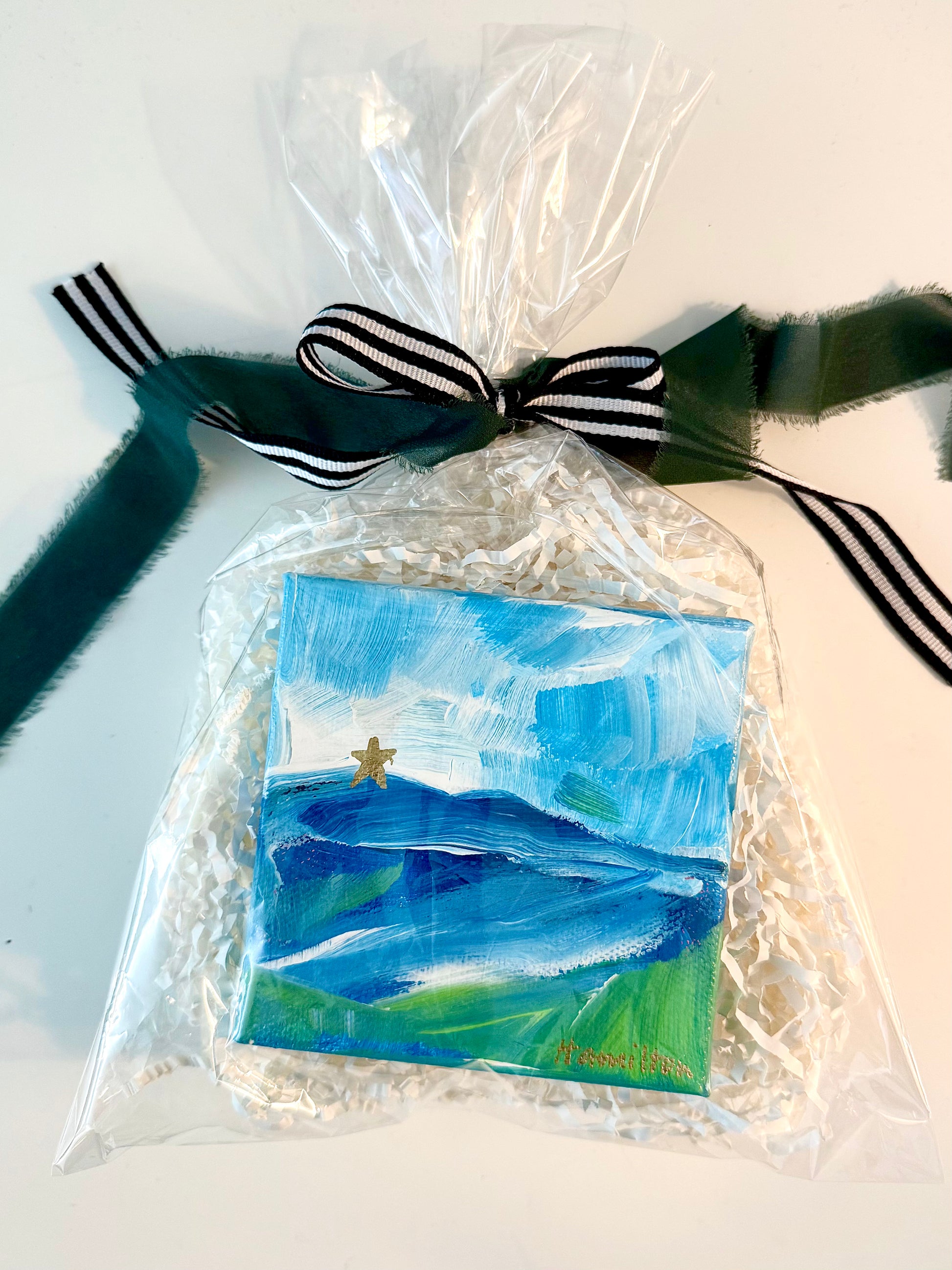 Giftable little shelfie of the iconic Mill Mountain Star in Roanoke Virginia! A 4” x 4” original painting stretched canvas with metallic gold star accent. Unframed.