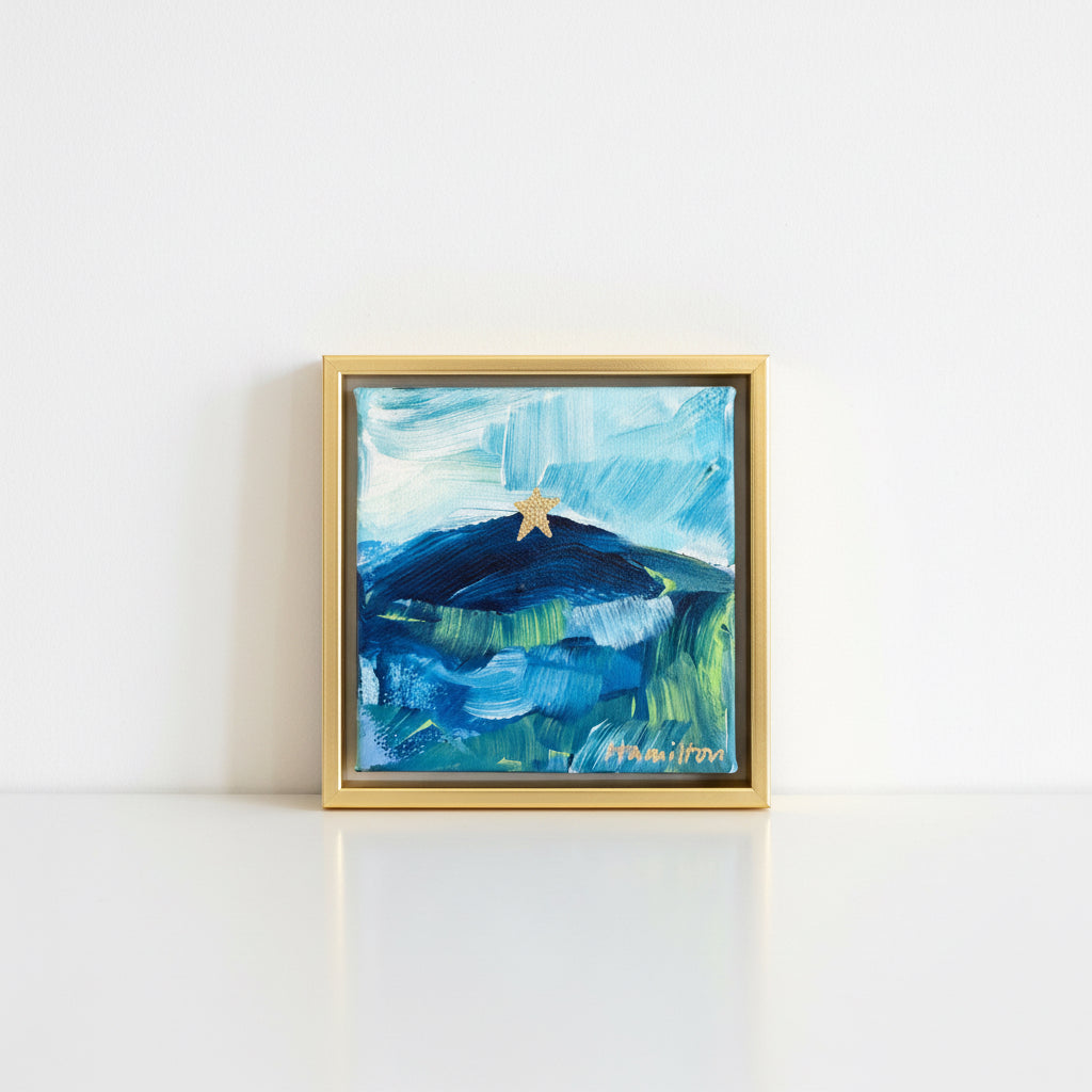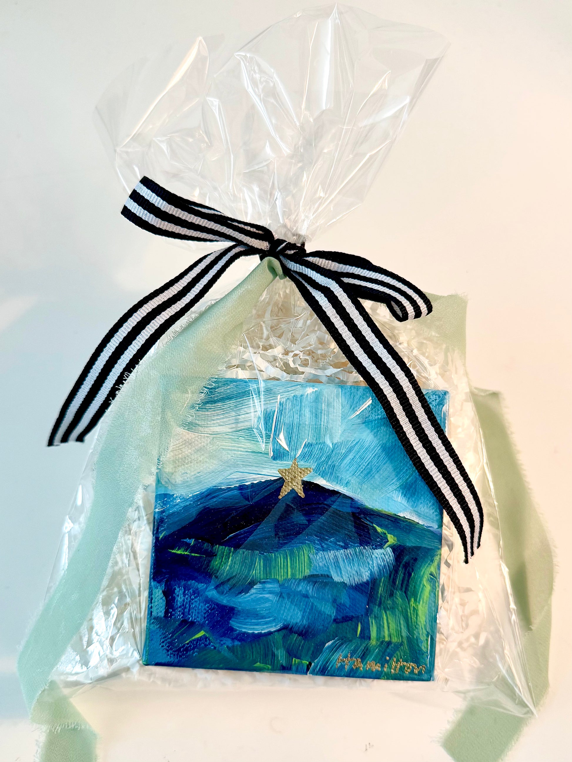 Giftable little shelfie of the iconic Mill Mountain Star in Roanoke Virginia! A 4” x 4” original painting stretched canvas with metallic gold star accent.