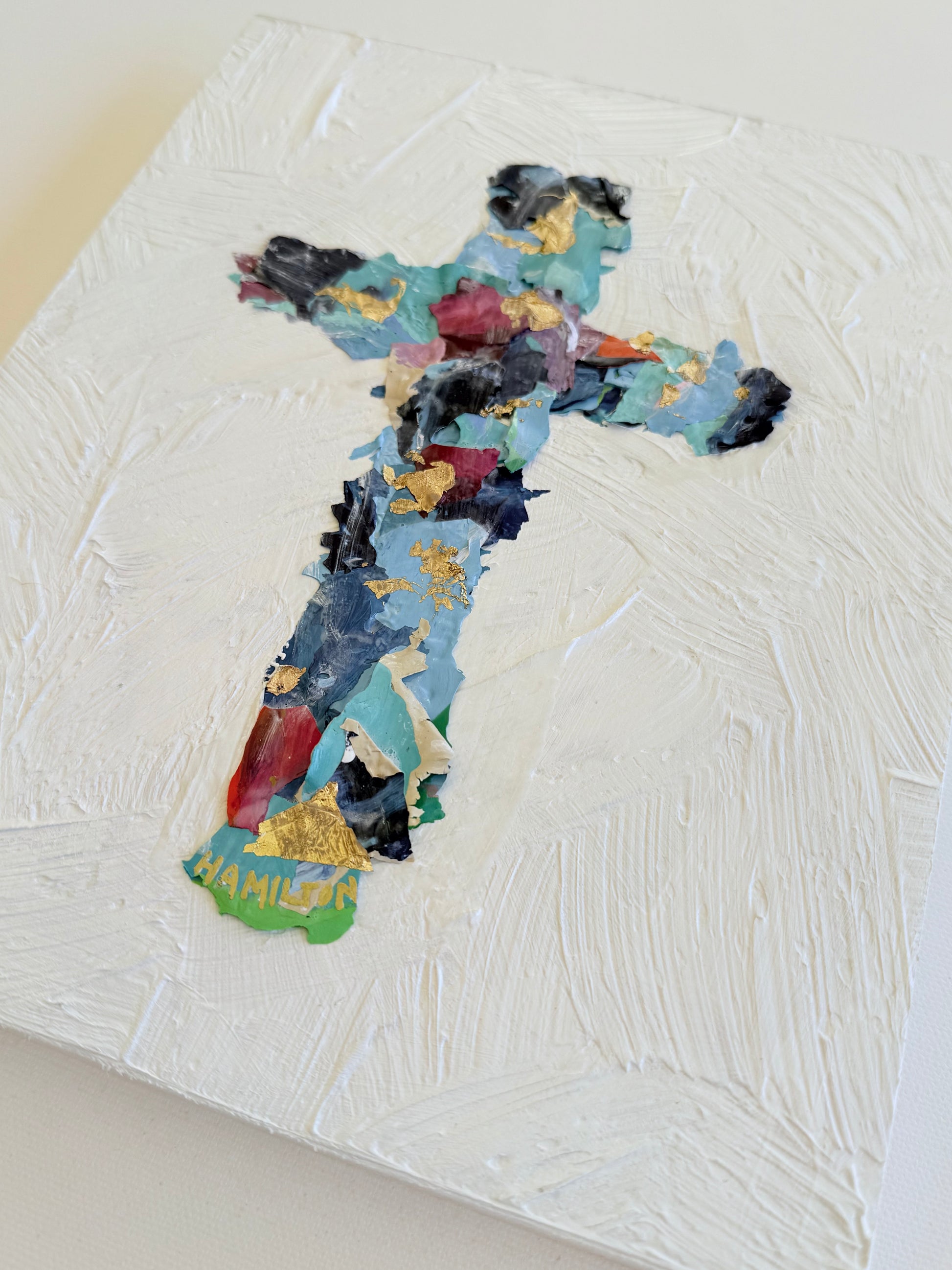 This distinctive new series presents an iconic form created entirely through a process of transformation and renewal. Each of my crosses are a unique composition, built from paint skins—the colorful, dried remnants peeled from my used palettes.