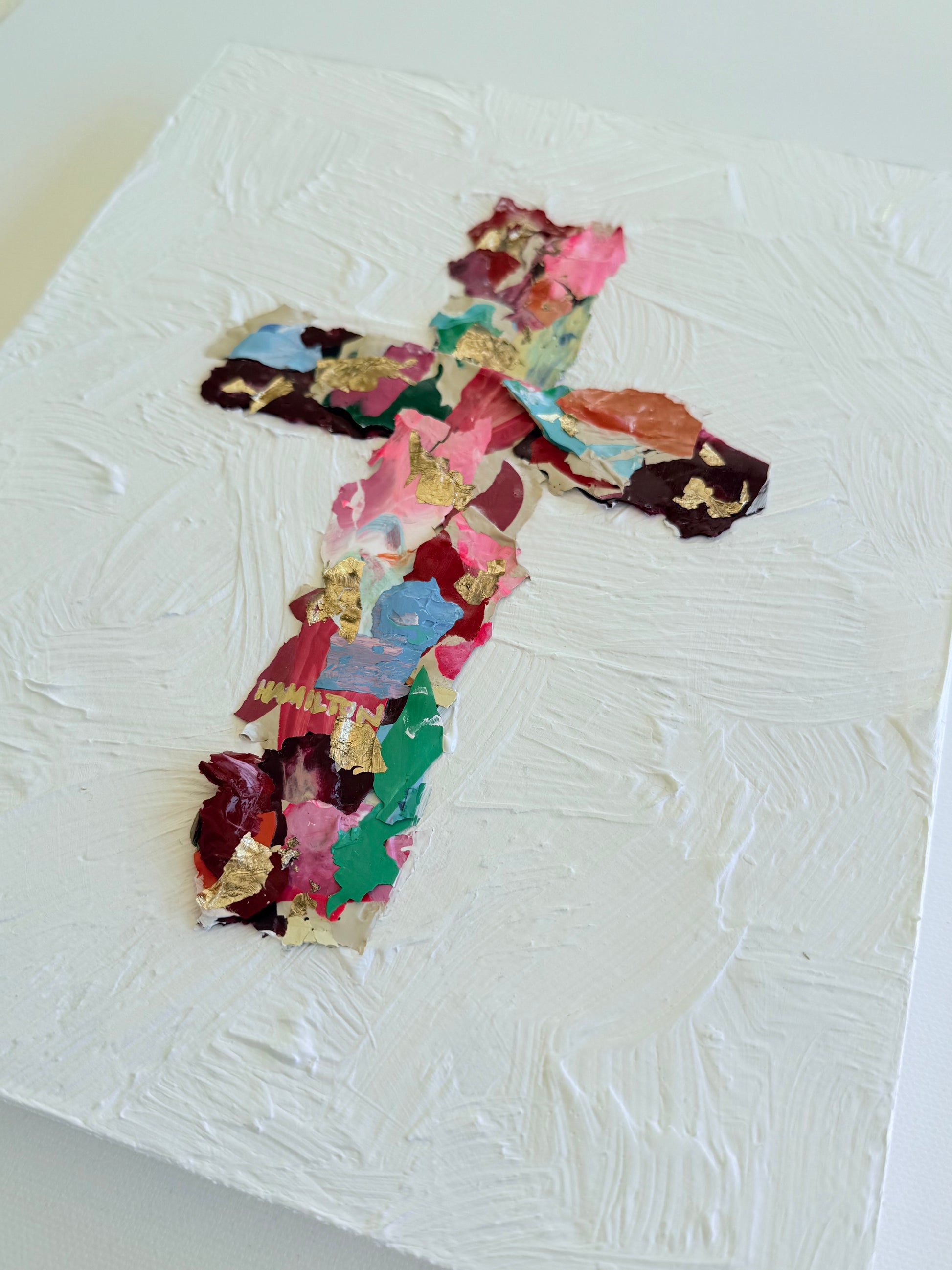 This distinctive new series presents an iconic form created entirely through a process of transformation and renewal. Each of my crosses are a unique composition, built from paint skins—the colorful, dried remnants peeled from my used palettes.